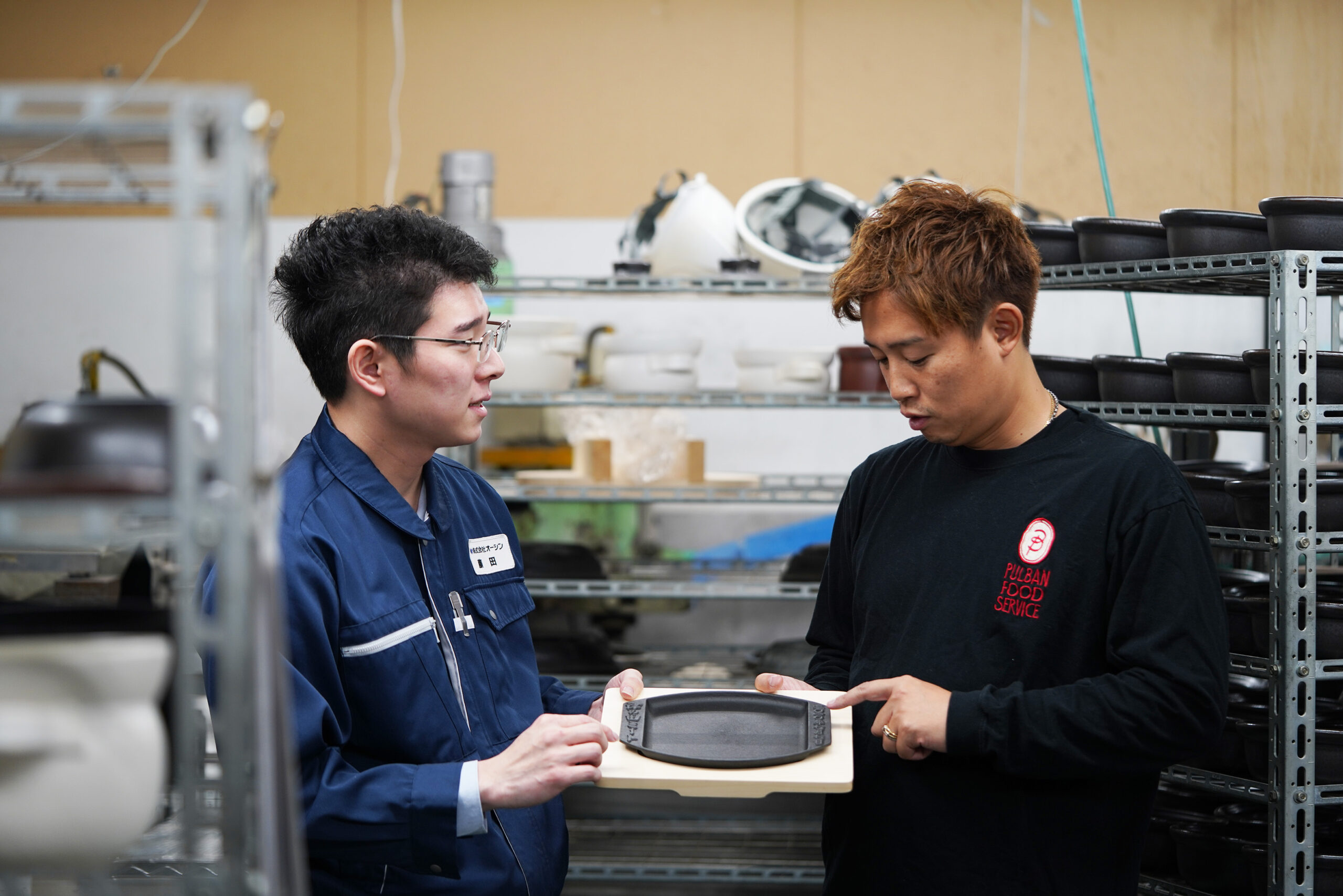 厨房の環境をより良くしたい、働く人の負担を減らしたい、料理をより美味しく味わって欲しいというプルバンさんの願いを実現するため、津の田ミートオリジナルのステーキ皿の開発をする御縁をいただきました。