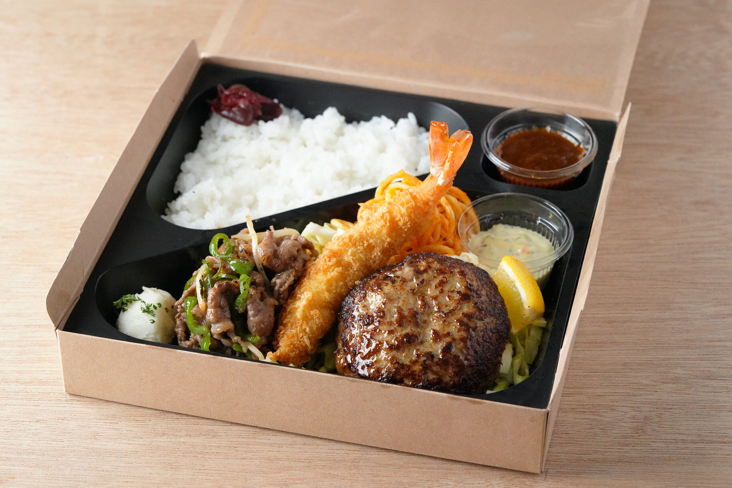 シンプルに津の田の和牛ハンバーグを味わいたいお弁当から、エビフライや和牛ステーキと盛り合わせた豪華弁当など、価格も1,500円前後~提供するよう研究開発をしました。
